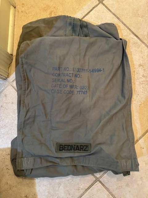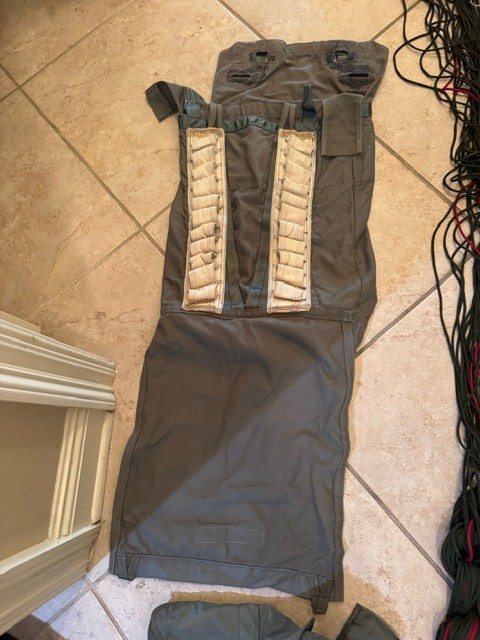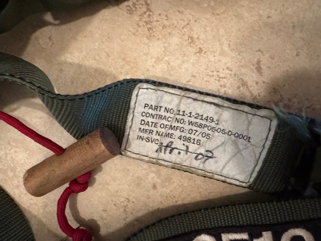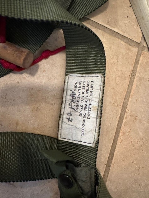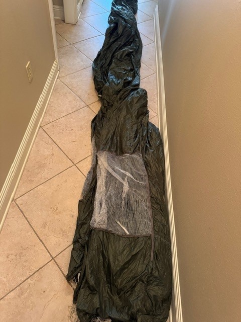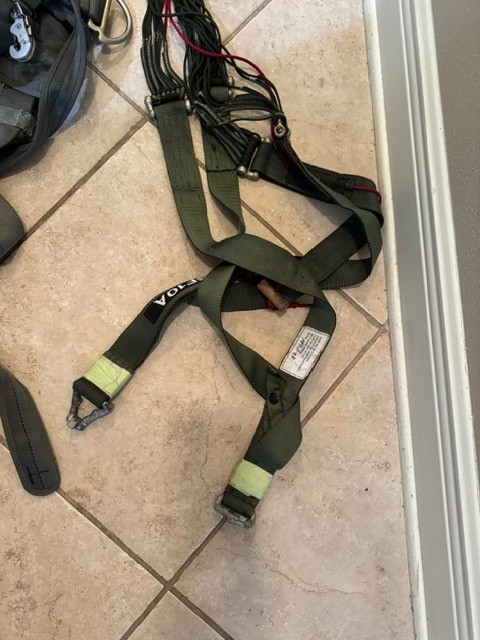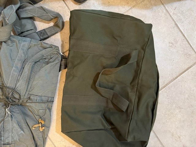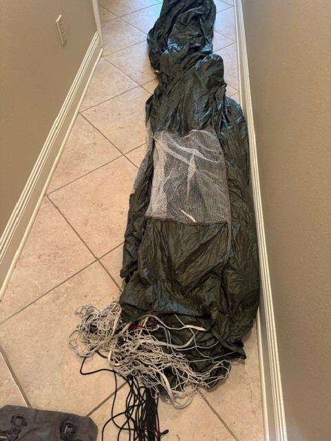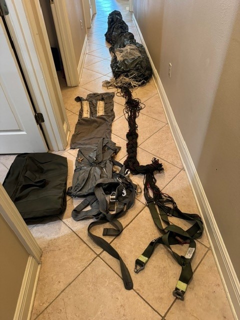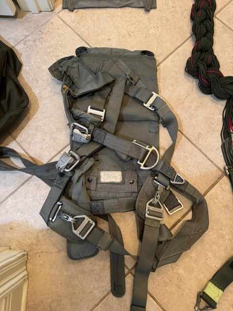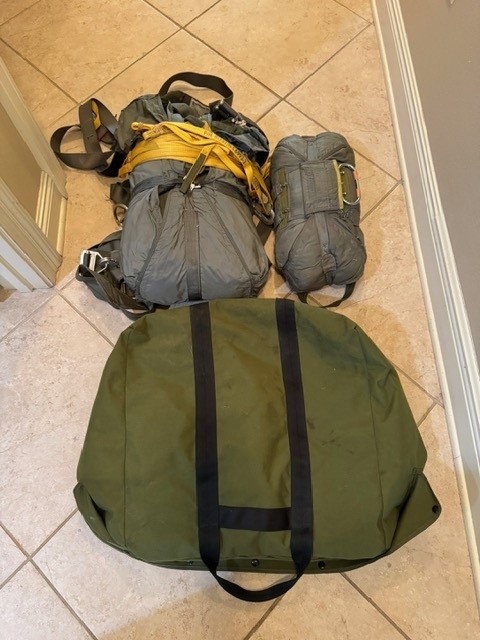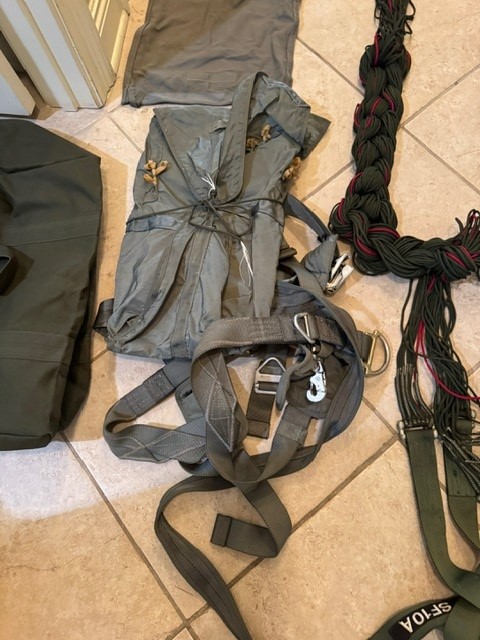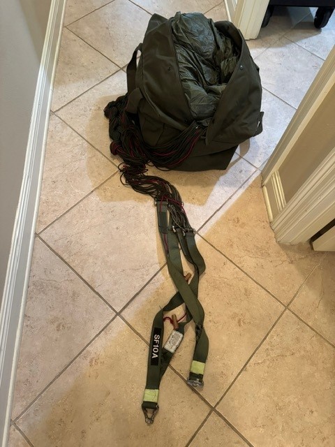 **Vintage Military Surplus Parachute** comes with harness assembly, suspension lines, and canopy.